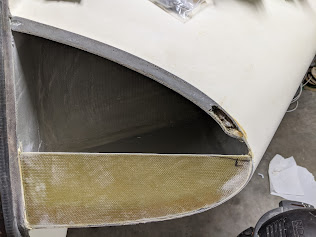 On the 18th, I cut 2 plies BID for the fresh air scoop and glassed it to the inside skin after filling the voids. This is some ugly glass because of the paint... but it'll be okay.