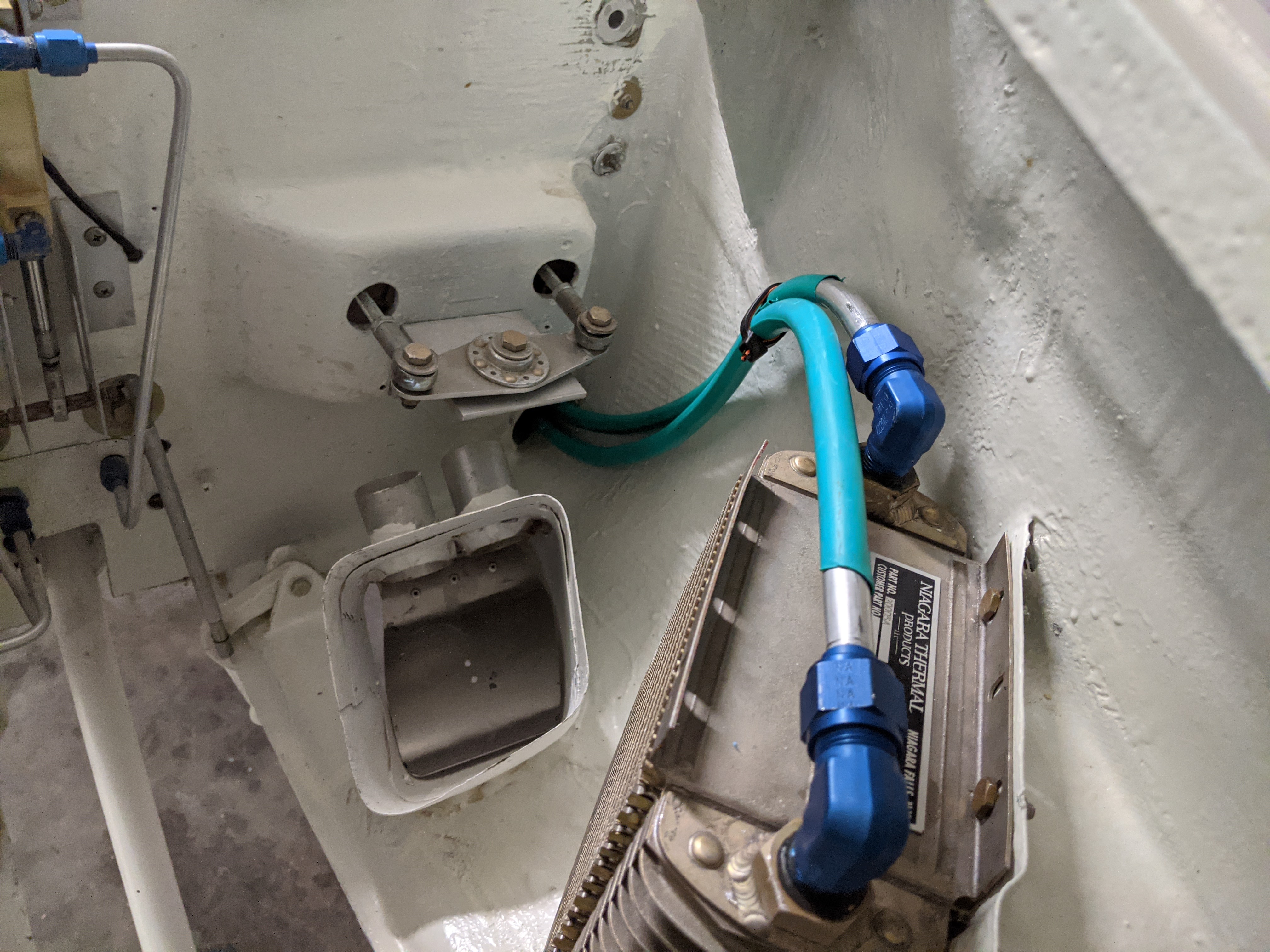 Lastly, I installed the oil cooler lines from the oil cooler back out the rear of the firewall, but have not terminated them there yet.